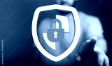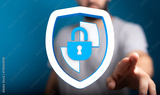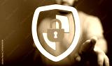 Abstract concept of digital security, featuring a shield, a lock, and a person's hand. Represents protection, safety, and online priv