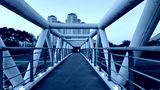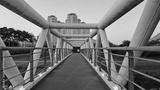 Modern pedestrian bridge with geometric structure leading toward city buildings