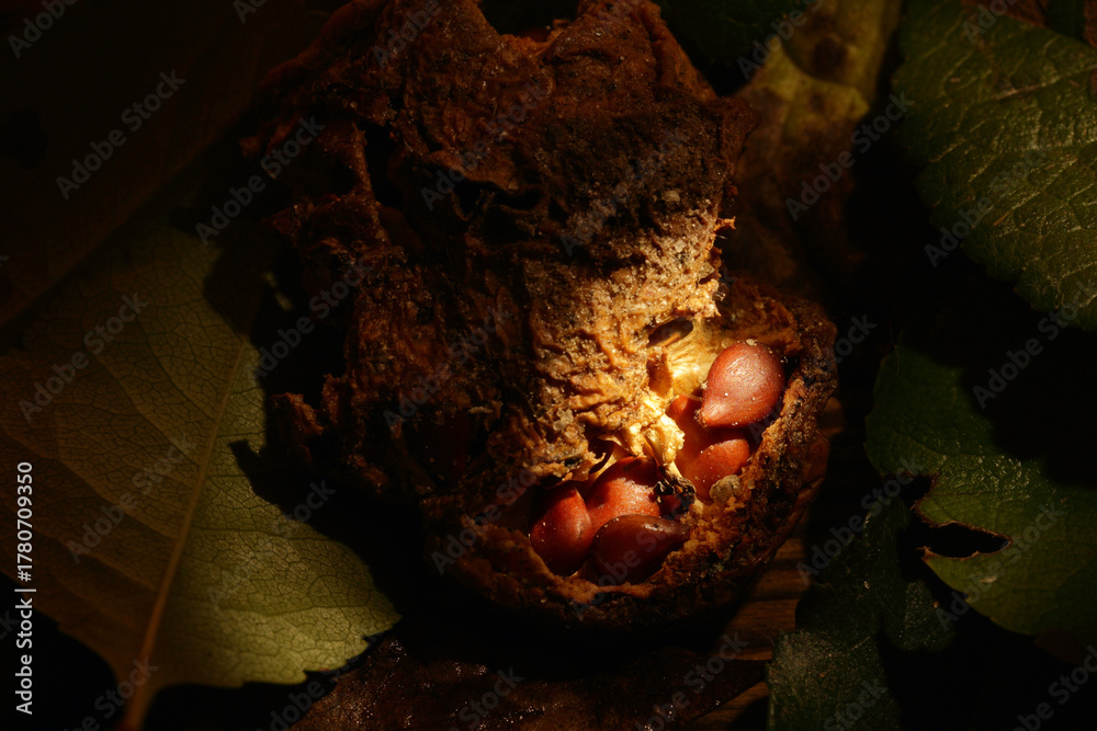 Ripe seeds in a cracked quince fruit, ready to germinate. The secret of life.