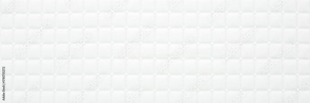 White soft cloth cover background of orthopedic mattress or pillow. Wide banner. Closeup. Empty place for text. Top down view.