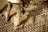 Worker within orange boots pouring wet concrete over reinforced steel grid at construction site under daylight