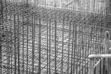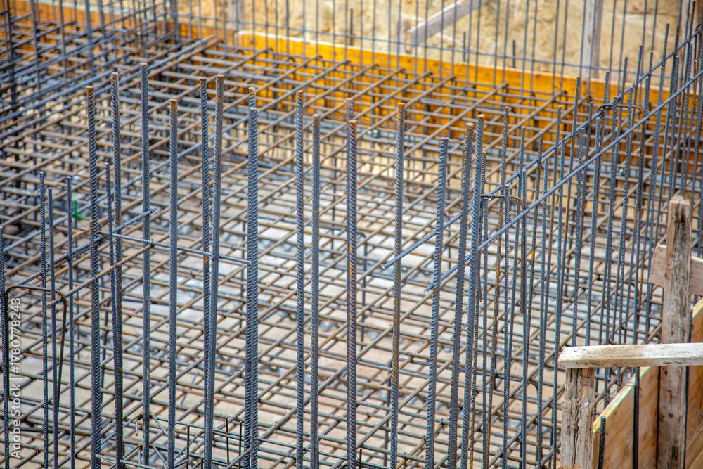 Metal rebar grid forming the base of the concrete foundation at a construction site under daylight conditions