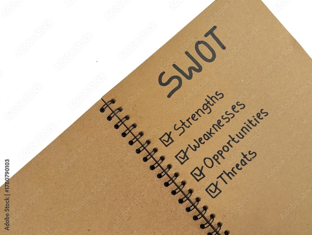 SWOT hand writing on a brown notebook. Business strategy and planning concept, Flat lay