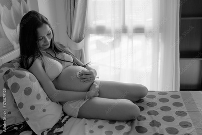 beautiful pregnant women using stethoscope to listning baby on bed in white and black style