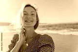 Portrait of happy young woman enjoying fresh air on the beach. Beautiful smiling female having fun on the ocean. Concept freedom and carefree vacation. Beach Holidays.