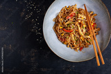 Shirataki noodles stir-fried in spicy soy sauce. Shirataki noodles with shimeji mushrooms. Asian cuisine. Top view.