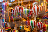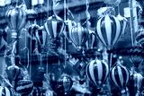 Christmas store window. Sale of Christmas ball in the form of air balls. Colorful glass toys for the Christmas tree. Decor decor holiday mood background