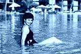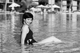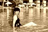 brunette woman in a black bikini sits in a shallow pool at a luxury resort.