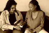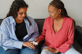 African mother measuring pulse with oximeter to her daughter at home - Health care, family and disease concept