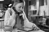 Young woman drinking coffee or tea in cafe and using digital tablet