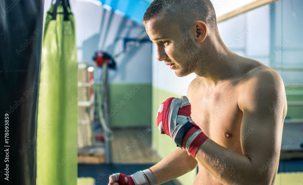 Side view of handsome kick-boxer practicing with punching bags in gym.