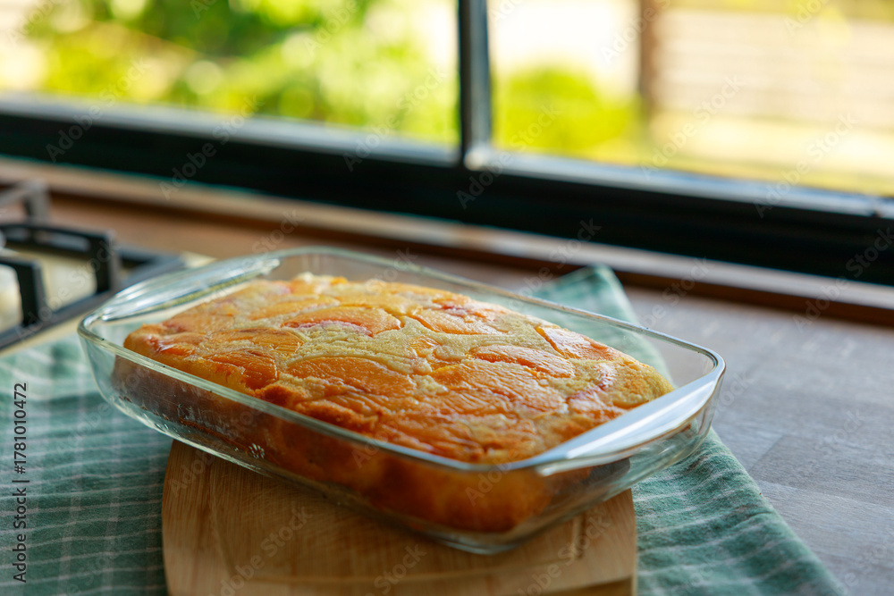 Peach cake in a glass dish on a wooden board on the kitchen counter