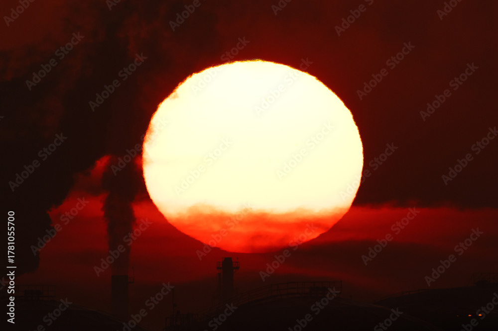 Dramatic Sunrise, chimney with smoke and oil tanks in the morning, Bahrain