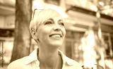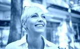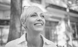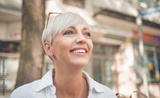 Close-up nice middle adult woman with blond short hair. Cheerful female person looking to side dressed in white summer shirt. Outdoors