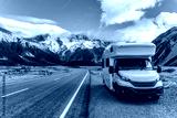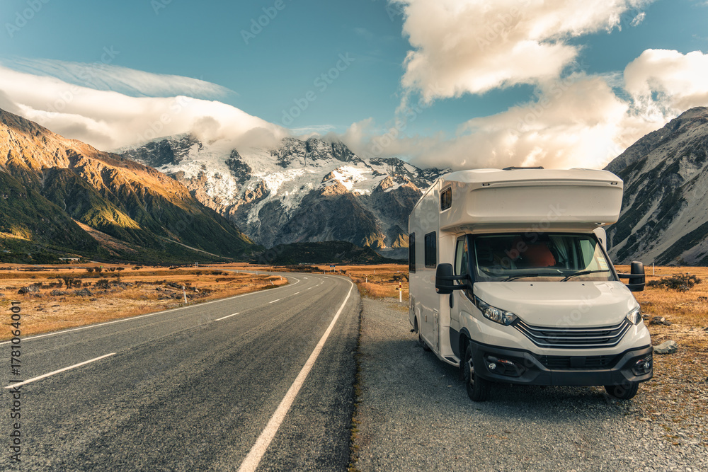 Motorhome parked on roadside with Mount Cook over road in autumn at New Zealand