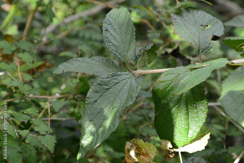 Viburnum dilatatum, the linden viburnum, a deciduous shrub with white flowers in summer and bright red berries in autumn, tolerant to poor soil and pollution. Photographed in Korea.