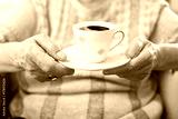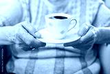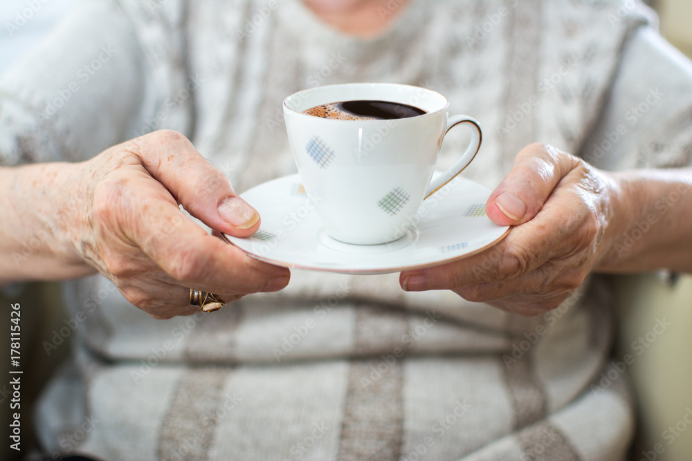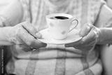 Closeup of wrinkled senior woman's hands holding coffee cup.