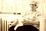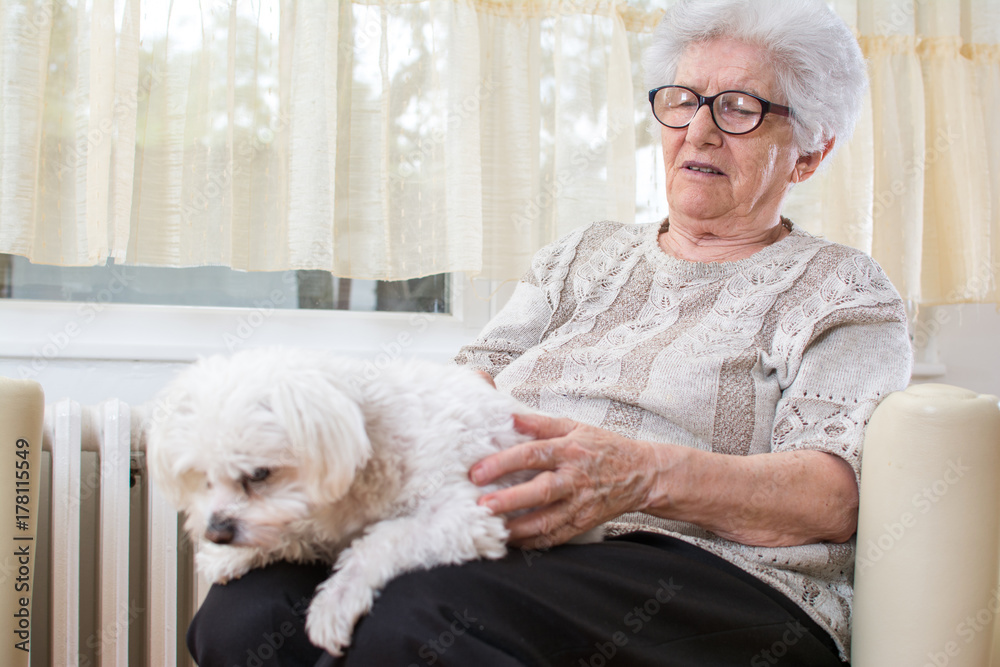 Old woman holding small dog in her lap while relaxing on armchair at home.