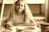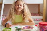 creative girl engaging in vibrant beadwork, focused and smiling at her craft table. artistic hobbyist surrounded by colorful beads, showcasing creativity and concentration in cozy room
