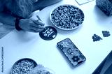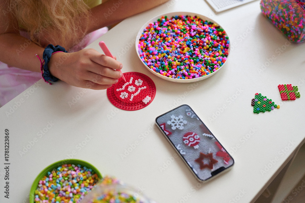 girl crafting colorful bead patterns beside smartphone, focusing on creativity and diy projects. artistic hobby setup promoting mindfulness, relaxation, and tech-free engagement