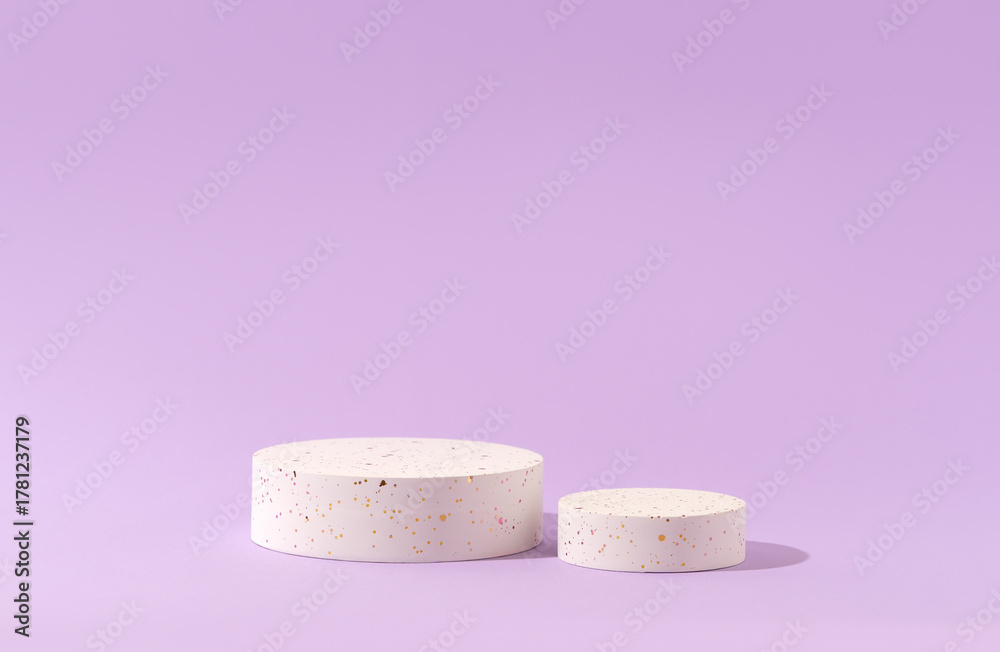Beauty Cosmetics Product Presentation Scene made with Two Round Podiums on Pastel Purple Background. Perfect for Product Advertising, Showcase.