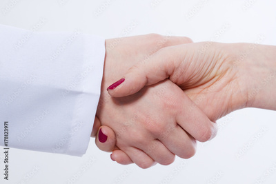 Female doctor's hand holding patient hand isolated on white background. Macro. Hospital