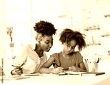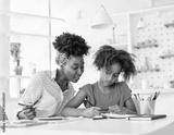 Mother and daughter doing homework at home. Mom and teenage black girl happy writing. Teen girl and parent sitting at home working at the table