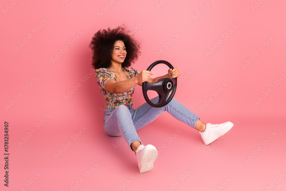 Cheerful young woman holding a steering wheel against a pink background exuding positivity, fun and vibrant energy