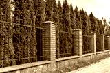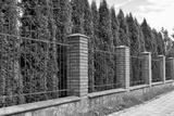 High fence with brick columns. Black Railings and brick wall