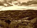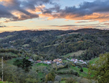 El Caspiu village and Pirnadi in background, Nava municipality, Comarca de la Sidra, Asturias, Spain