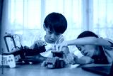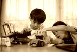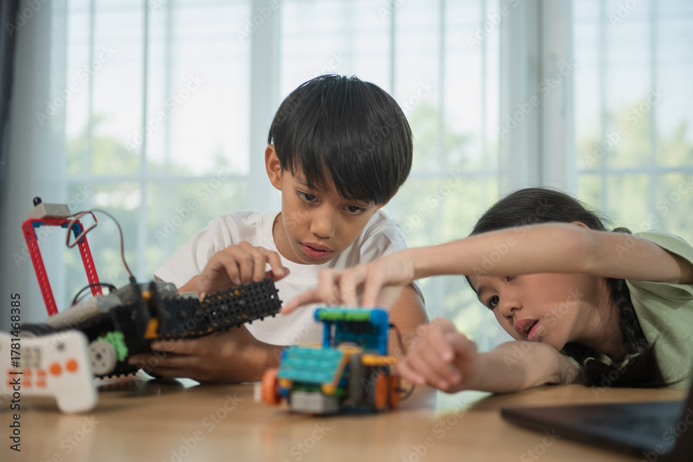 Kids playing with construction blocks on table, child playing and building with colorful plastic bricks.