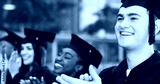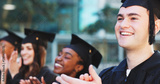 Applause, graduation and students with man in college for celebration, diploma success and ceremony. Achievement, university degree and academy pride with people on campus for scholarship event