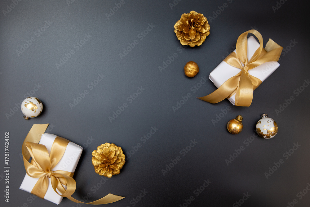 Merry Christmas and Happy New Year greeting card, frame, and banner. Holidays design. Noel and Feliz Navidad. Gifts and decorations, top view, flat lay. Text space, copy space winter background.