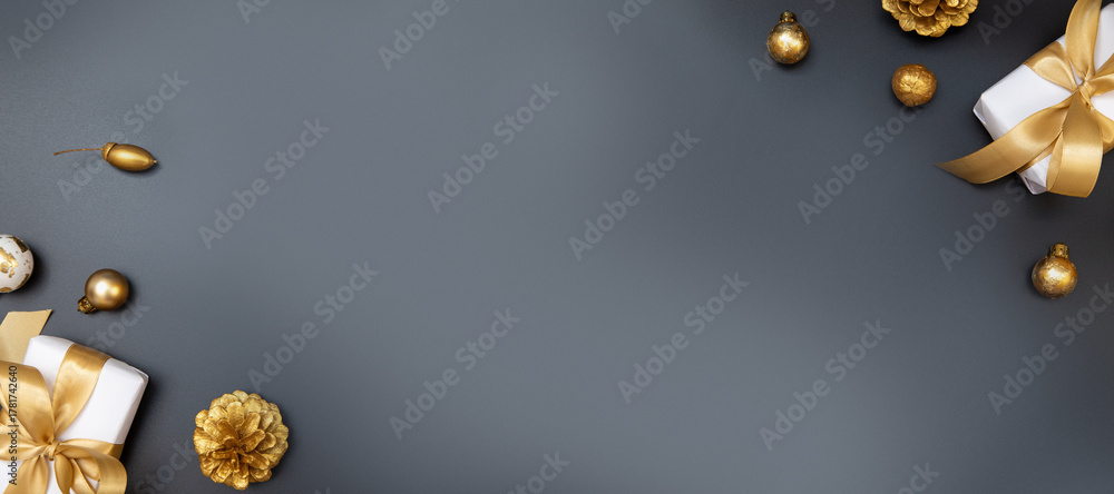 Merry Christmas and Happy New Year greeting card, frame, and banner. Holidays design. Noel and Feliz Navidad. Gifts and decorations, top view, flat lay. Text space, copy space winter background.