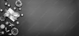 Merry Christmas and Happy New Year greeting card, frame, and banner. Holidays design. Noel and Feliz Navidad. Gifts and decorations, top view, flat lay. Text space, copy space winter background.