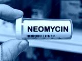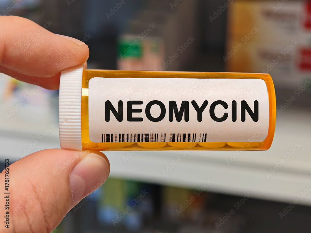 Box of NEOMYCIN tablets on a hospital pharmacy table used to treat bacterial infections an aminoglycoside antibiotic.