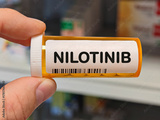 Box of NILOTINIB tablets on a hospital pharmacy table used to treat chronic myeloid leukemia a tyrosine kinase inhibitor.