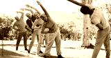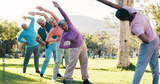 Class, stretching and instructor with old people in park for wellness, workout or mobility exercise. Joint friendly training, retirement and learning with senior men and women outdoor for warm up