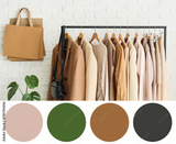 Rack with stylish clothes near white brick wall in stylist's studio