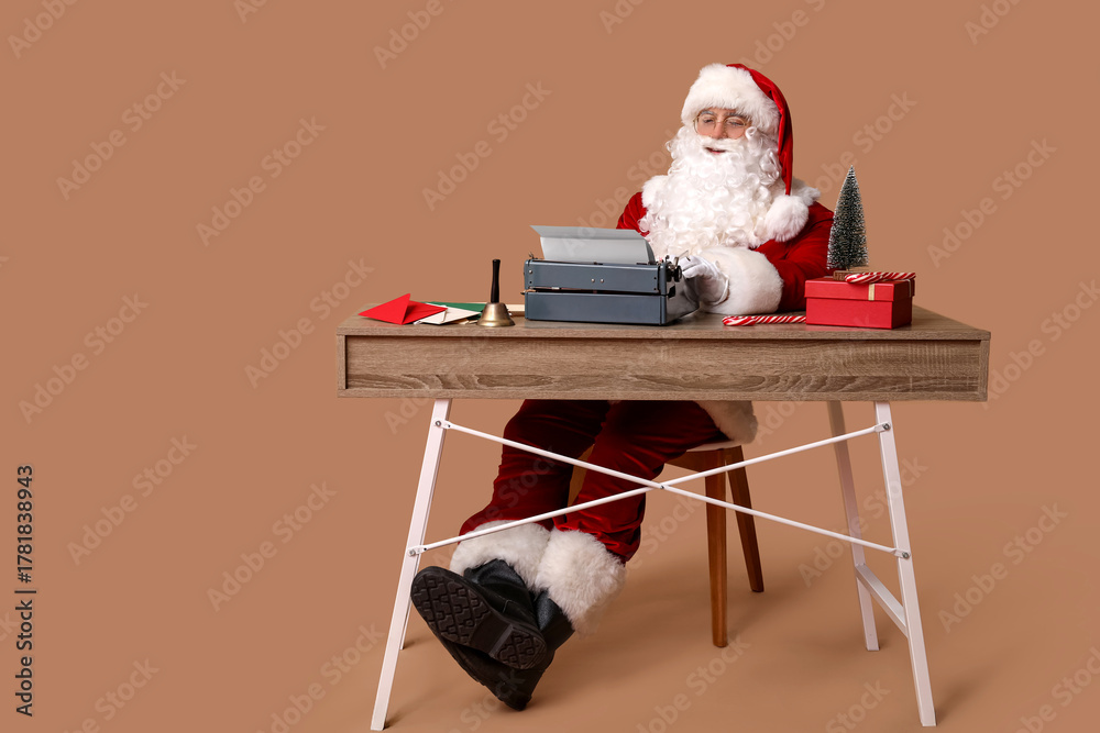 Santa Claus with vintage typewriter, envelopes, gift box, candy canes and jingle bell at table on brown background