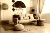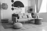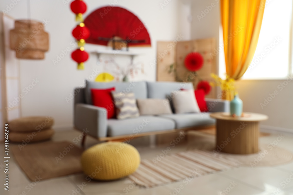 Blurred view of living room with grey sofa and decorations for Chinese New Year celebration