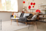Blurred view of living room with sofa, shelf units and decor for Japanese New Year celebration