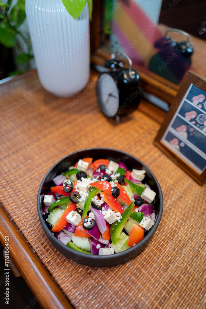 Fresh and vibrant Greek salad with a variety of colorful ingredients. This close-up captures a delicious and healthy meal