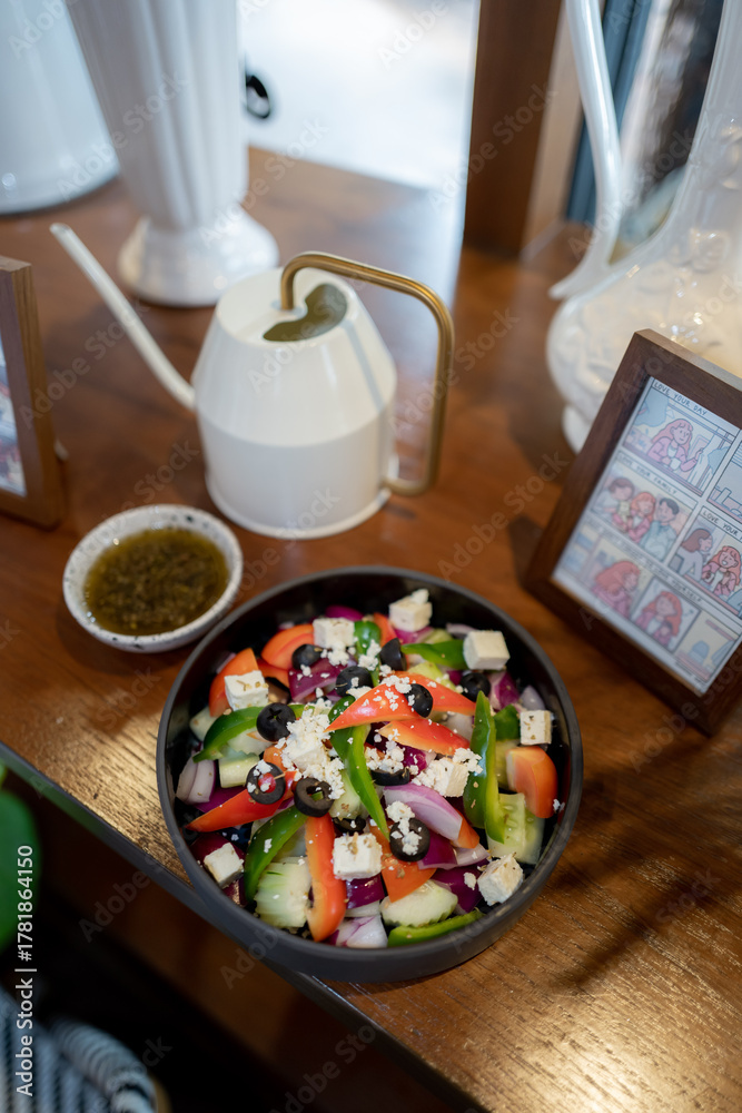 A colorful Greek salad with fresh ingredients, garnished on a wooden table