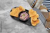 Delicious heart-shaped waffles and savory dish on a serving tray ready to eat