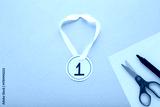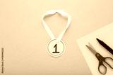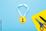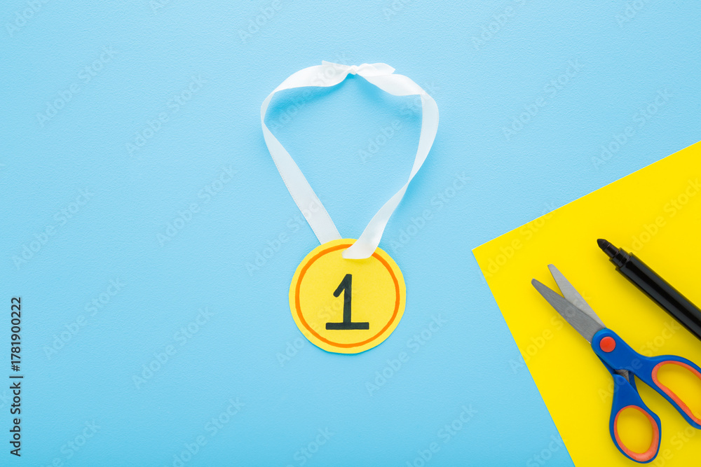 Created yellow gold paper medal with white ribbon on light blue table background. Pastel color. Closeup. Little child handcraft. Flat lay. Top down view.