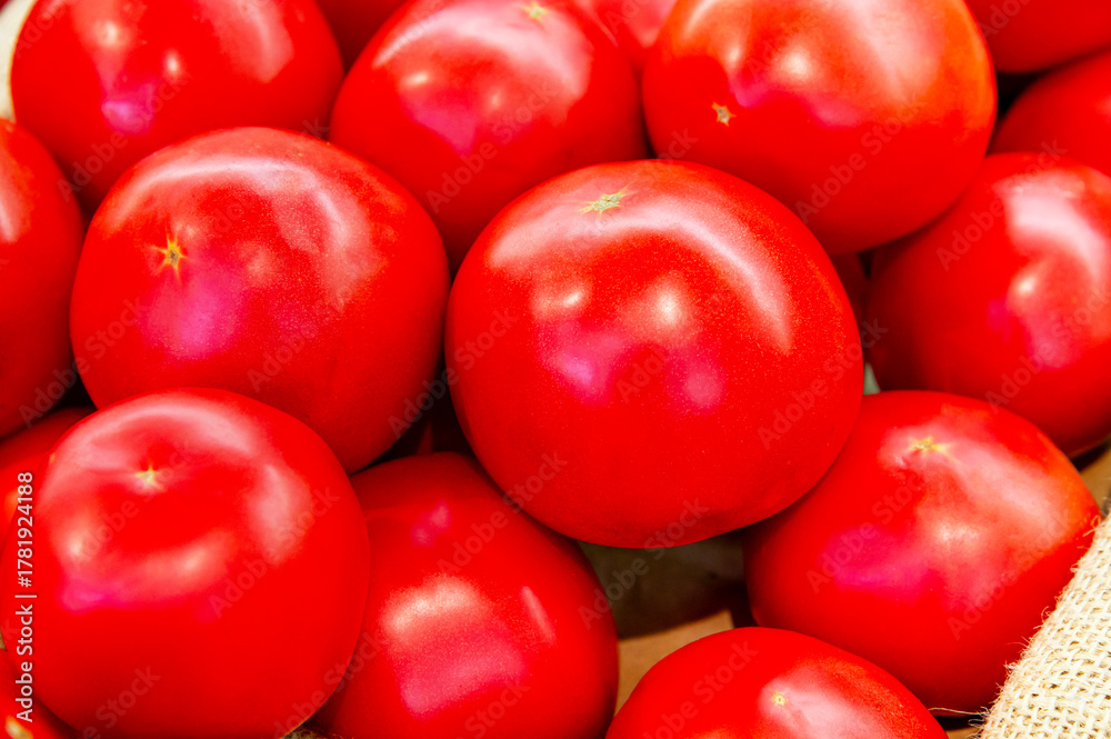 Close-up of many bright fresh tomatoes on a branch in a grocery store