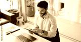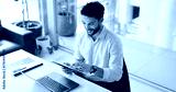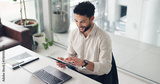 Tablet, happy and businessman with laptop in office with research for finance project with company budget. Digital technology, computer and financial manager with investment proposal in workplace.