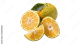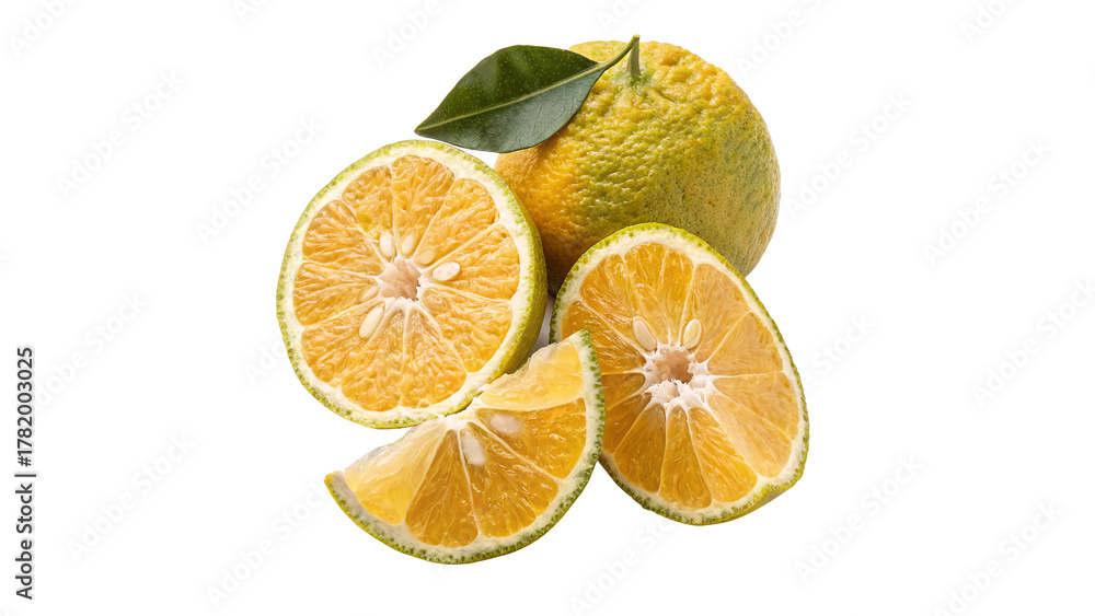 Fresh citrus fruit with vibrant yellow color and green leaves arranged attractively on a transparent background