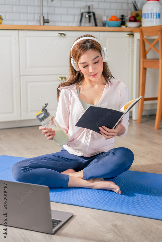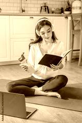 happy peaceful active Asian woman enjoys morning yoga break home sitting calmly checking her workout diary and tracking her fitness progress.headphones she listens relaxing ambient sounds embracing
